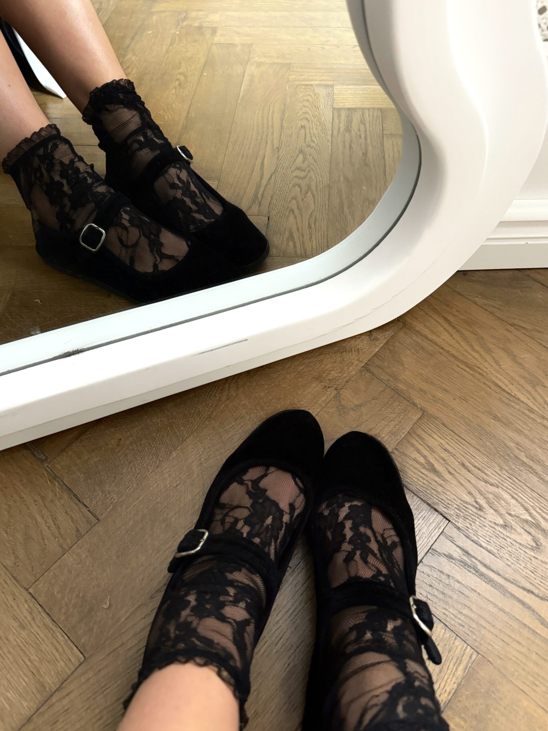 Czarne koronkowe skarpetki wykończone delikatną falbanką.